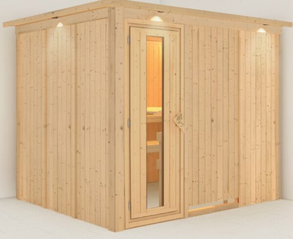 Een paneelsauna van Karibu is snel en gemakkelijk te plaatsen en warmt sneller op dan een massieve sauna. Standaard wordt de cabine geleverd zonder dakrand en saunakachel.