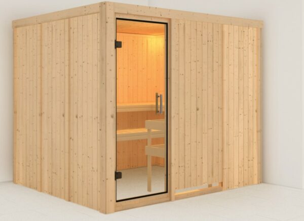 Een 68 mm systeemsauna wordt opgebouwd uit losse panelen die gemakkelijk en snel in elkaar te zetten zijn. De zichtbare wanden van de systeemsauna zijn van vurenhout met daartussen wol isolatie. (13 mm hout – 42 mm isolatie met speciale aluminiumfolie – 13 mm hout) De niet-zichtbare achterwanden zijn van hardboard en wol isolatie.